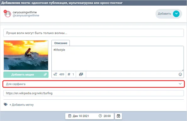 Теперь в форме поста вы можете выбрать доску для публикации пина: