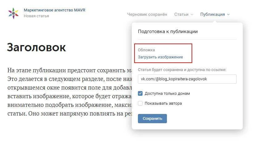 На этапе публикации сохраните материал, а затем выберите обложку. Это делается в следующем разделе, после нажатия кнопки «Сохранить». В открывшемся окне появится поле для добавления медиафайла. Вставьте изображение, которое будет отображаться на странице. Подберите изображение, максимально подходящее по тематике статьи. Оно может напрямую повлиять на решение людей прочитать статью.