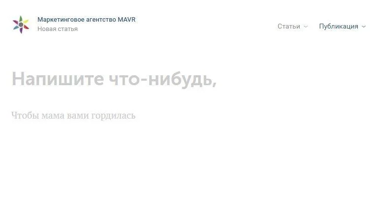 После нажатия кнопки «Статьи», откроется редактор. Он выглядит как пустое поле для ввода заголовка и основного текста.