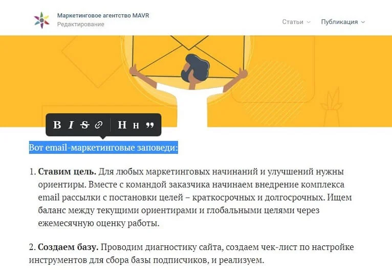Чтобы материал был принятым для глаз, используйте форматирование. Выделение важных фрагментов, подчеркивание, заголовки и цитаты улучшают визуальное восприятие текста. В редакторе просто их оформить. Если выделить фрагмент над ним, появится панель инструментов.
