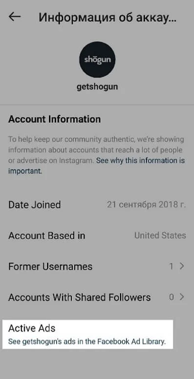 Рекламные публикации в инстаграм можно посмотреть через бизнес-страницу Facebook. В приложении Инстаграм можно посмотреть активные объявления для бизнес-аккаунтов. Для этого нужно нажать три точки меню, там выбрать «Активные объявления». Если такой кнопки нет, то либо аккаунт личный, либо сейчас он ничего не рекламирует.
