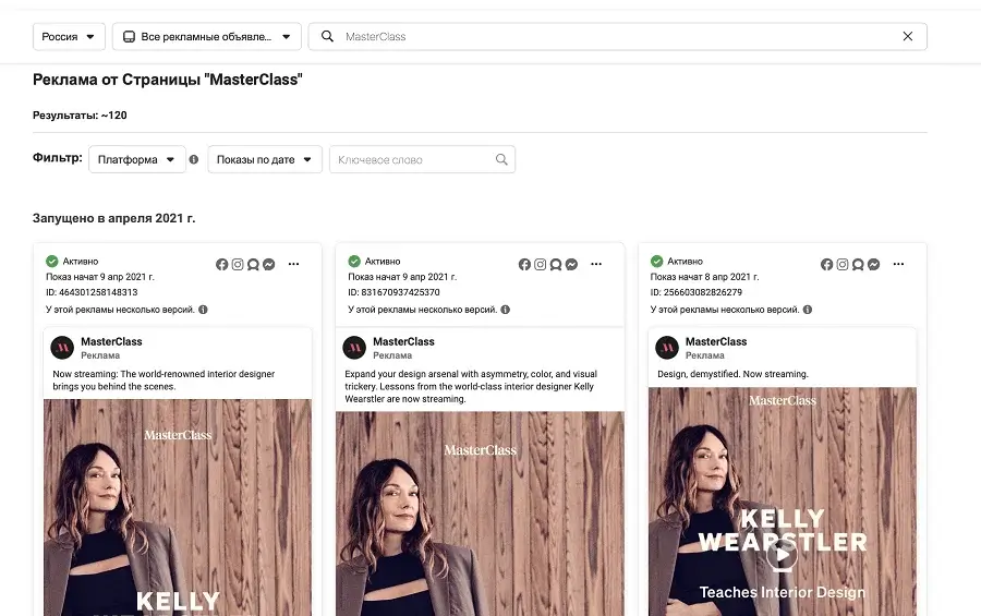 И вы увидите все запущенные рекламные объявления. Они фильтруются по геолокации, платформе и времени последнего показа.