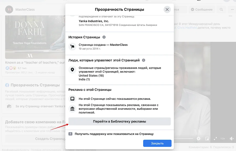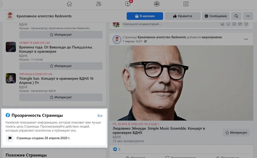 Посмотреть всю запущенную таргетированную рекламу можно без дополнительных инструментов, просто зайдя на любую бизнес-страницу в Facebook. Там в разделе главная нужно найти окошко «Прозрачность страницы» и нажать кнопку «Все».