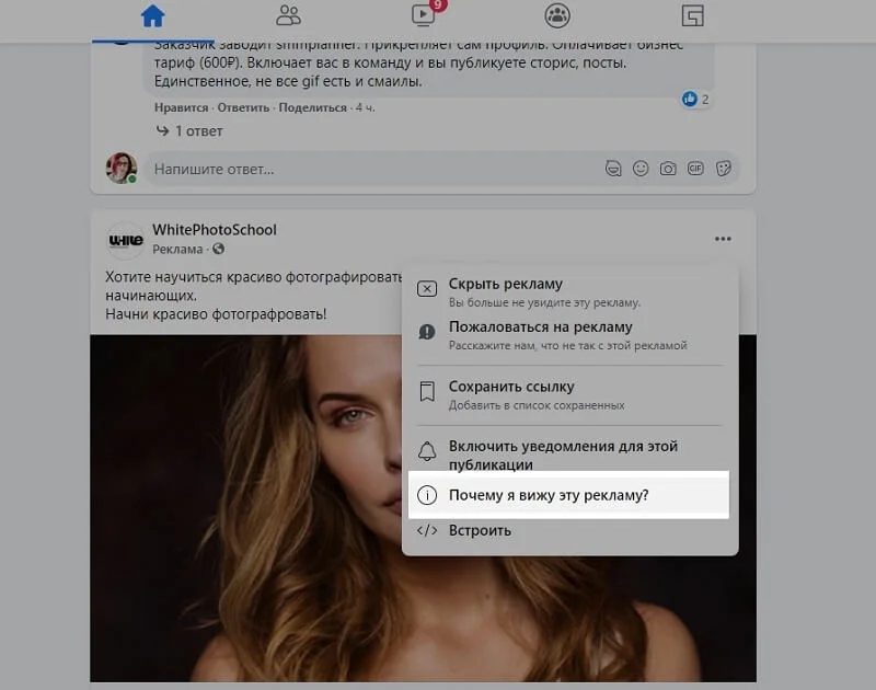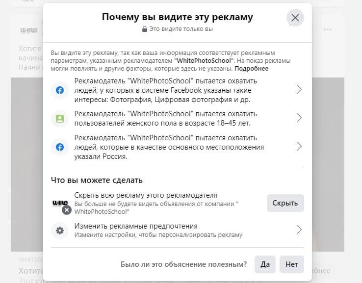 Другим способом будет вылавливание таргетированной рекламы в своей ленте. Когда вы увидите рекламное объявление, выберите опцию «Почему я это вижу».