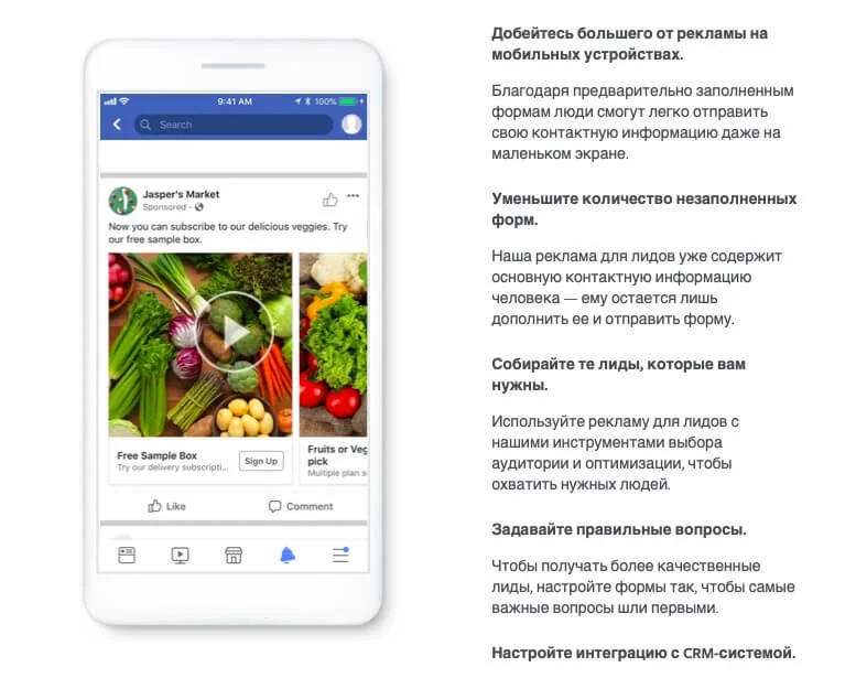 Позволяет быстрее собирать контакты потенциально заинтересованных в продукте или услуге пользователей. При клике на подобное объявление появляется контактная форма, уже заполненная доступной информацией из аккаунта пользователя (имя, город и т.д.) и ему останется лишь получить рекламное предложение.