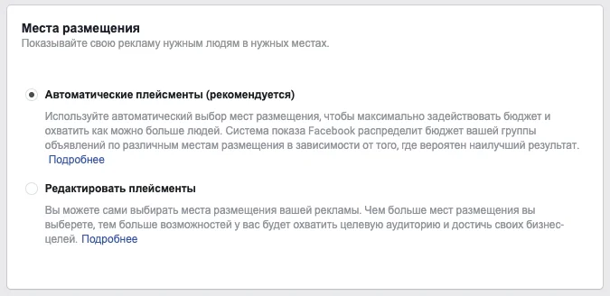 Это места размещения будущего объявления на Фейсбук и в Инстаграм. По умолчанию при создании новой кампании стоят «Автоматические плейсменты», но рекомендуется настраивать места размещения индивидуально для каждого объявления.