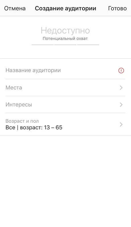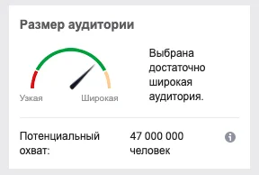 В колонке справа вы увидите раздел «Размер аудитории». В нем по аналогии со спидометром будет показываться потенциальный охват в зависимости от точности настроек.