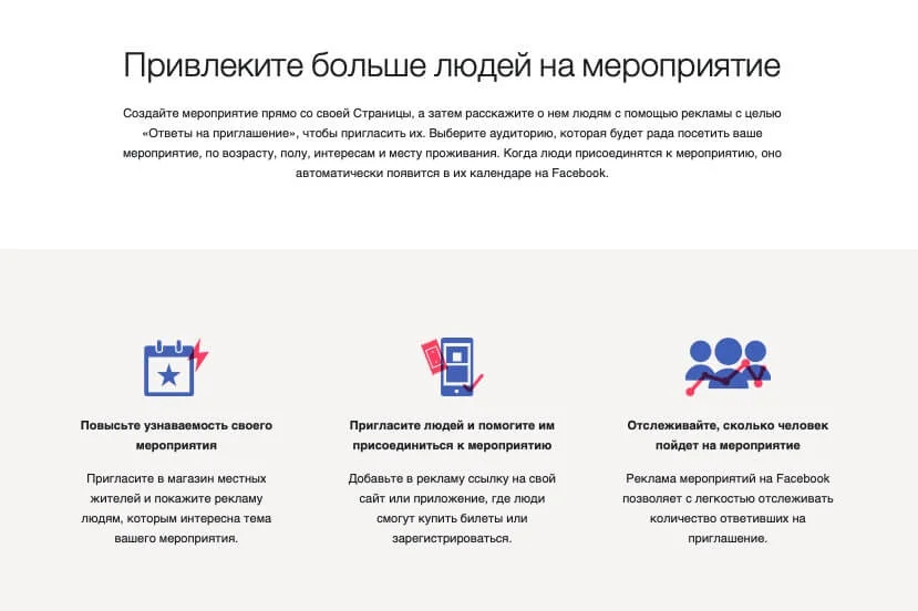Позволяет пригласить на мероприятие максимальное количество потенциально заинтересованных пользователей, повысить продажи и отследить эффективность рекламы для уже созданного на Фейсбук мероприятия.