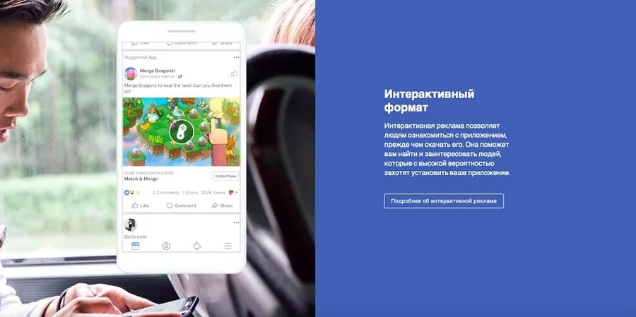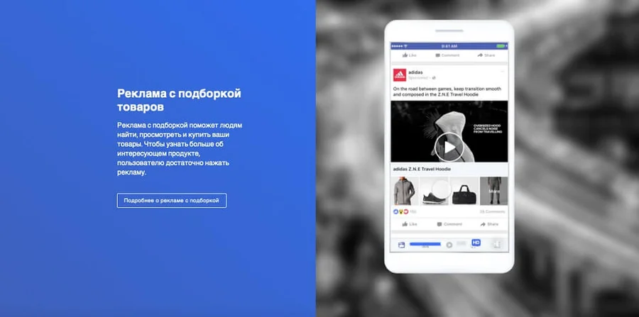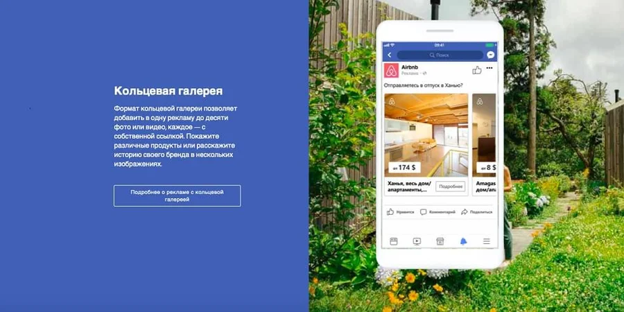 Адаптированный под площадку интерфейс с быстрой загрузкой, в который можно добавить изображение или видео. Плюс такого формата в том, что пользователю не нужно переходить по ссылке на сторонние сайты — Instant Experience открывается в том же окне.