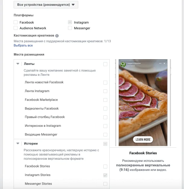 Платформа рекомендует размещать рекламу сразу на двух площадках (Фейсбук и Инстаграм) для того, чтобы охватить бо́льшую целевую аудиторию. Оптимизация объявления под разные форматы позволяет предложить лучший вариант размещения в зависимости от целей промо-кампании.