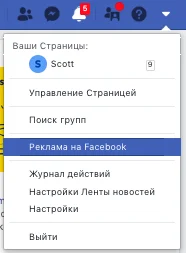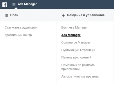 Перейти в него можно как из Business Manager, так и кликнув на раздел «Управлять рекламой» из выпадающего окна в правом верхнем углу страницы.