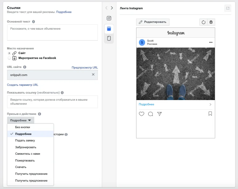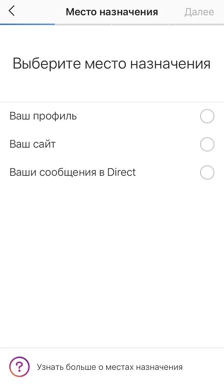 Профиль, с которого запускается реклама, сайт (настраивается URL и кнопка действия) или сообщения в директ.