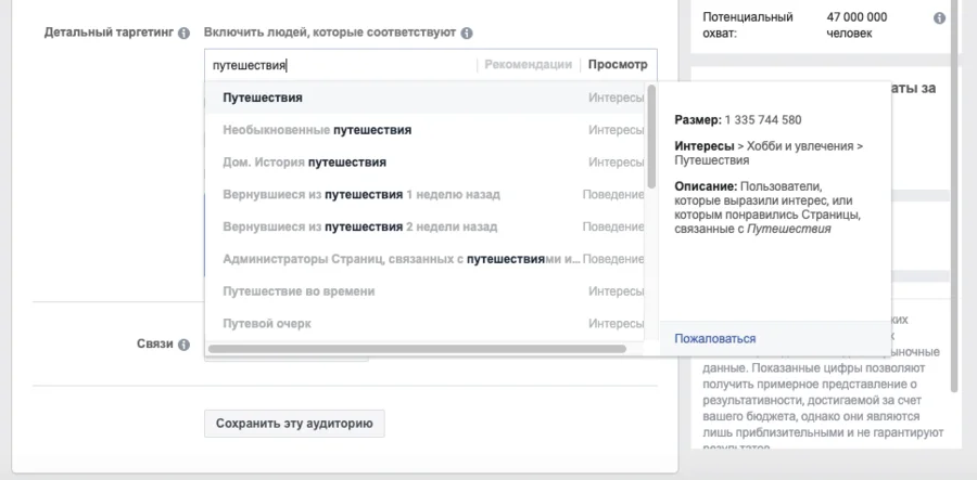 В подпункте «Детальный таргетинг» есть возможность настроить основные и смежные интересы потенциальной аудитории, чтобы охватить более узкий круг людей и повысить эффективность рекламы. Это могут быть путешествия, кофейни, музыкальные жанры, конкретные бренды и многое другое. Начните печатать название и выберите один из предлагаемых вариантов в выпадающем списке.