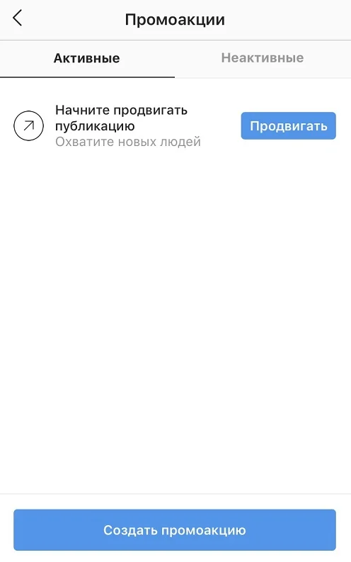 Для того, чтобы создать промоакцию для поста, необходимо нажать на кнопку «Продвигать» под ним, либо зайти в раздел «Промоакции» с главной страницы аккаунта.