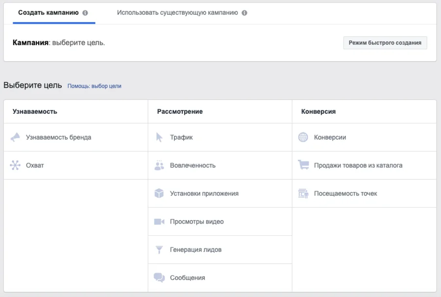 - Определите цель РК. Она выбирается в зависимости от нужд рекламодателя, а далее Фейсбук уже сам настраивает нужные алгоритмы для максимального попадания в целевую аудиторию.