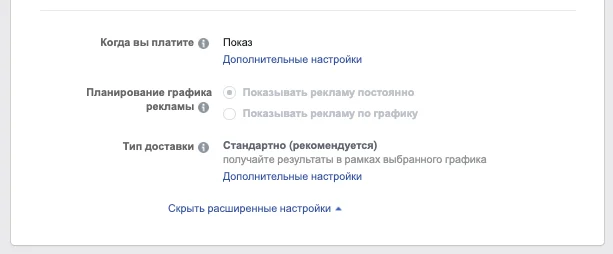 Кроме срока действия есть возможность задать ограничение по количеству показов на человека, запланировать время показа и настроить другие индивидуальные параметры. Некоторые из них могут быть недоступны для изменения: детальные настройки зависят от выбранного формата. Если какой-то из параметров блока нельзя изменить, значит Фейсбук рассматривает его как единственно возможный и максимально эффективный для выбранной ранее цели.
