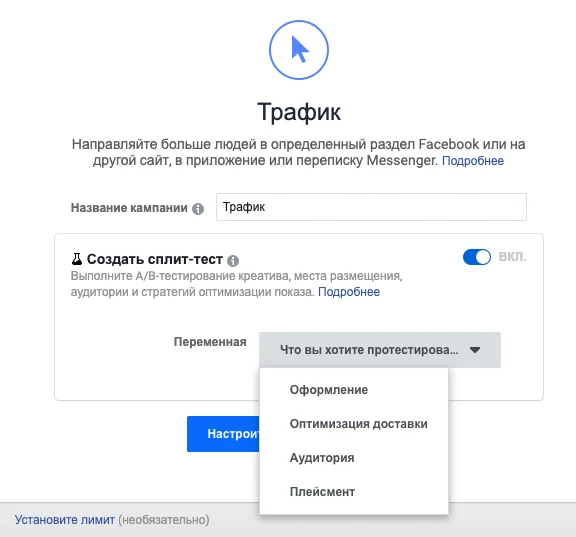 Некоторые из целей предлагают сделать A/B тестирование аудитории, креативов и других настроек, чтобы кампания была более эффективной. Например, выбрав цель «Трафик» рекламодатель может задать сплит-тест и проверить объявление на разных аудиториях или местах размещения.