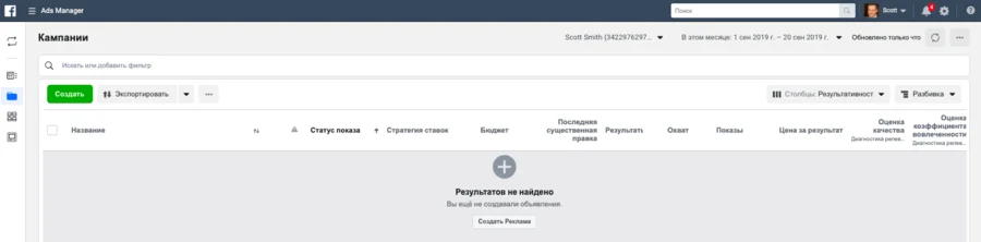 - В открывшемся Ads Manager вы увидите все созданные ранее и действующие рекламные кампании. Здесь же можно оценить эффективность каждой из них, посмотреть общий расход и другую статистику.