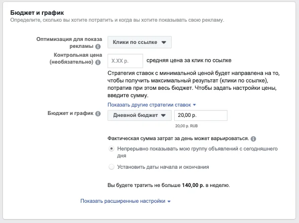 В этом разделе настраивается оптимизация показов и расходы на рекламу. Задать бюджет можно как с ежедневным лимитом, так и с общим ограничением на весь срок действия кампании. Далее настраивается дата начала и окончания показа рекламы. Калькулятор покажет, сколько спишется со счета рекламодателя в зависимости от длительности и дневного бюджета кампании. Там же указан налог, который добавится к итоговой сумме.