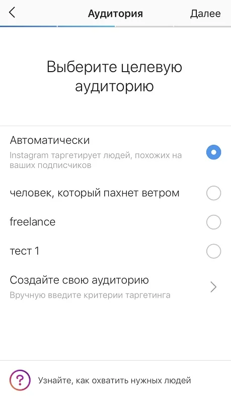 По умолчанию Инстаграм предлагает выбрать аудиторию автоматически. В этом случае реклама будет показываться людям, максимально похожим на ваших подписчиков.