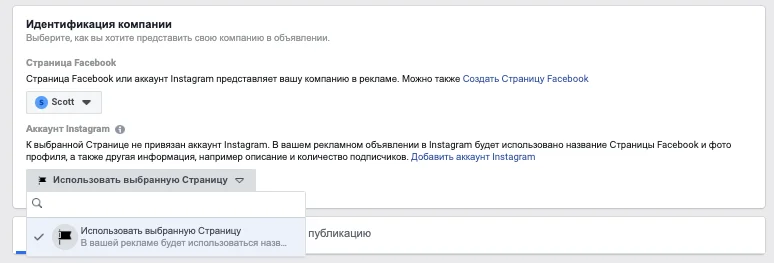 Не забудьте проверить раздел «Идентификация компании», который находится в шапке страницы, от нужного ли бизнес-аккаунта запускается ваша реклама. Если у вас несколько страниц, которые привязаны к одному рекламному кабинету, то просто выберите нужную в выпадающем списке.
