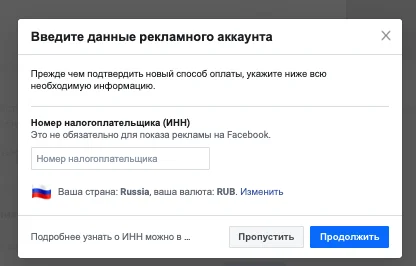 Если вы запускаете рекламу в первый раз, то Фейсбук попросит ввести налоговые данные и привязать желаемый способ оплаты. С привязанной карты раз в месяц будут списываться деньги за все проведенные в этот период кампании.
