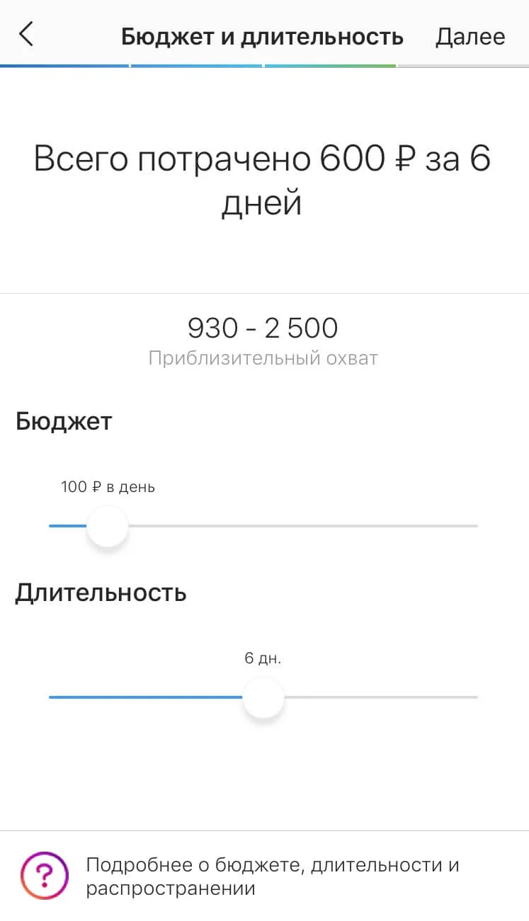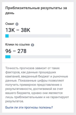 В этом разделе всего два ползунка — «Бюджет» и «Длительность». При их перемещении будет меняться прогнозируемый охват и итоговая сумма.