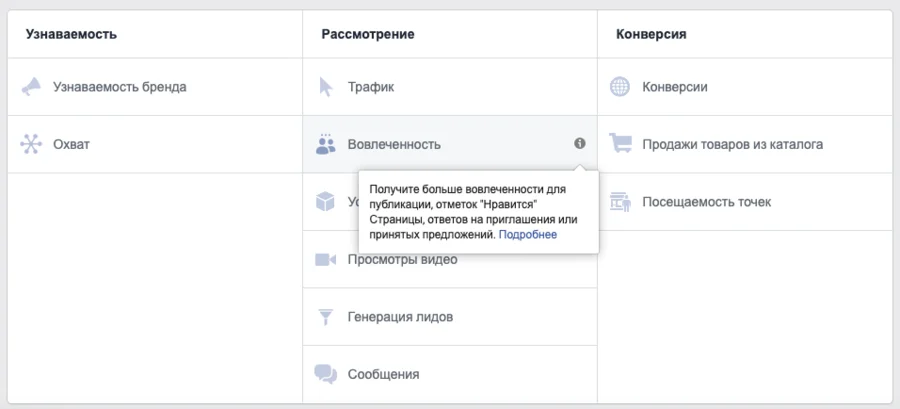 Подцели — трафик на сайт, вовлеченность, узнаваемость, охват и другие. Рядом с каждым вариантом есть небольшая подсказка, которая поможет правильно выбрать цель рекламной кампании.