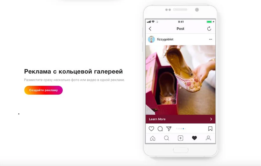 Такой формат позволяет загрузить до 10 изображений в один пост. Формат кольцевой галереи предполагает отображение рекламы в ленте в квадратной или вертикальной ориентации. Кроме того, некоторым аккаунтам доступна возможность отмечать на фотографии товары с ценами и ссылками на интернет-магазин.