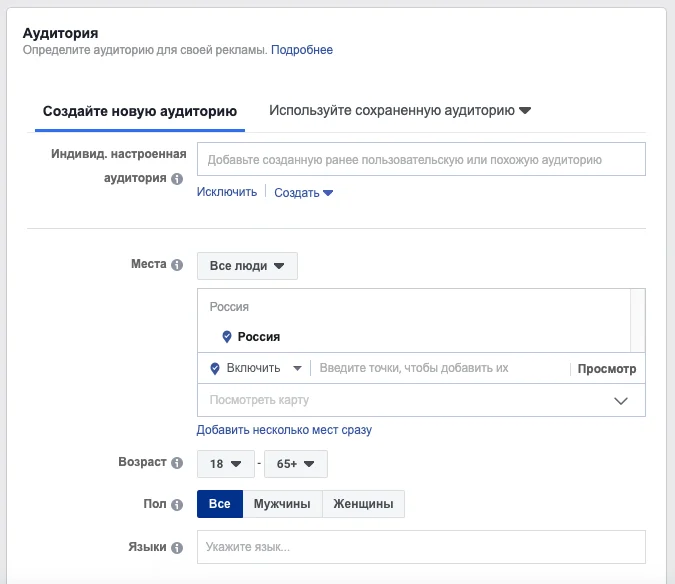 Можно использовать как ранее сохраненную, так и создать новую прямо во время редактирования объявления. Задайте страны, города или локацию с небольшим радиусом для охвата людей, которые будут находиться рядом с конкретным местом (рестораном, магазином и т.п.).