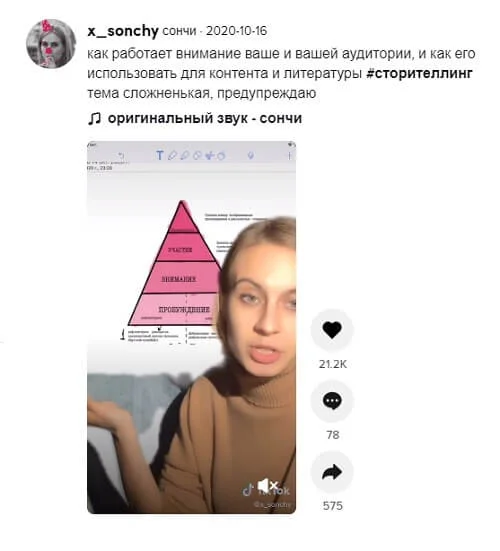 В TikTok пользователи ждут одновременно активного и личного общения с автором канала. Контент стоит подавать неформально и лучше как личное мнение. Нужно быть готовым быстро снимать видео-ответы на комментарии. Даже серьезный обучающий контент должен быть непринужденным.