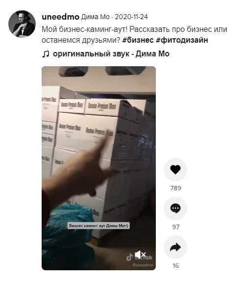 - Дневник проекта. Для стартапов большой отклик дает дневниковый формат с освещением бизнес-схемы, запуска и развития бизнеса. Но с этим форматом нужно быть осторожным: в TikTok много мошенников и псевдо-бизнесменов. Чтобы вас не приняли за них, показывайте только свой реальный опыт и данные, не злоупотребляйте кликбейтом. “Чудесные” истории успеха получают много просмотров, но мало доверия.