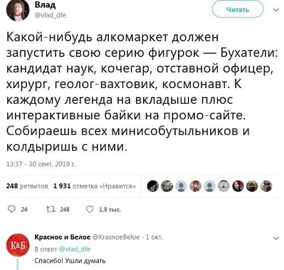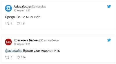 Кейс Красного & Белого в Твиттере – это пример легендарного взлета бренда, который решил пойти путем шуток и веселья. За 3 месяца развития аккаунта они получили 20 000 подписчиков, которые остались с ними ради ежедневной дозы (нет, не алкоголя) самоиронии и житейских мемов. Подписчики, кстати, не остались в стороне – они сами постили что-то на алко тему и отмечали аккаунт бренда. Так вирус и пошел по стране.