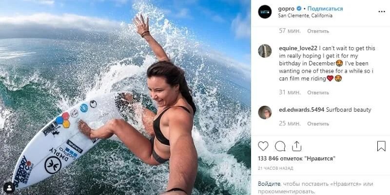 Бренд популярных камер публикует лучшие фото и видео пользователей, которые отмечают аккаунт бренда на своих страницах. Получается очень красивый и залипательный контент, пользующийся большой популярностью без дополнительных стимуляций. В виральной кампании использует 2 хэштега: #GoProHERO8 и #SuperPhoto.