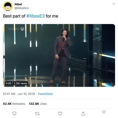 Для развития своего аккаунта Nibel делится популярным контентом, связанным с киберспортом. Так, отрывок из выступления Киану Ривза на презентации игры Cyberpunk 2077 для Xbox набрал более 2 миллионов просмотров и 42 тысяч ретвитов. На видео во время выступления кто-то из зала кричит “You are breathtaking”, на что актер парирует “No, you are awesome”. Отчасти в виральности этого твита заслуга самого Киану, но словить момент и донести его до масс – тоже талант.