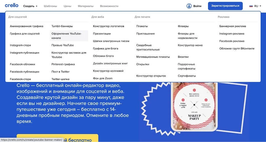 Crello.com визуальный конструктор предоставляет 14-дневный пробный период и большую галерею доступных изображений.