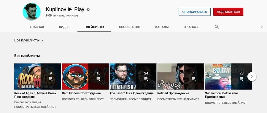 - Ссылки на плейлисты канала;