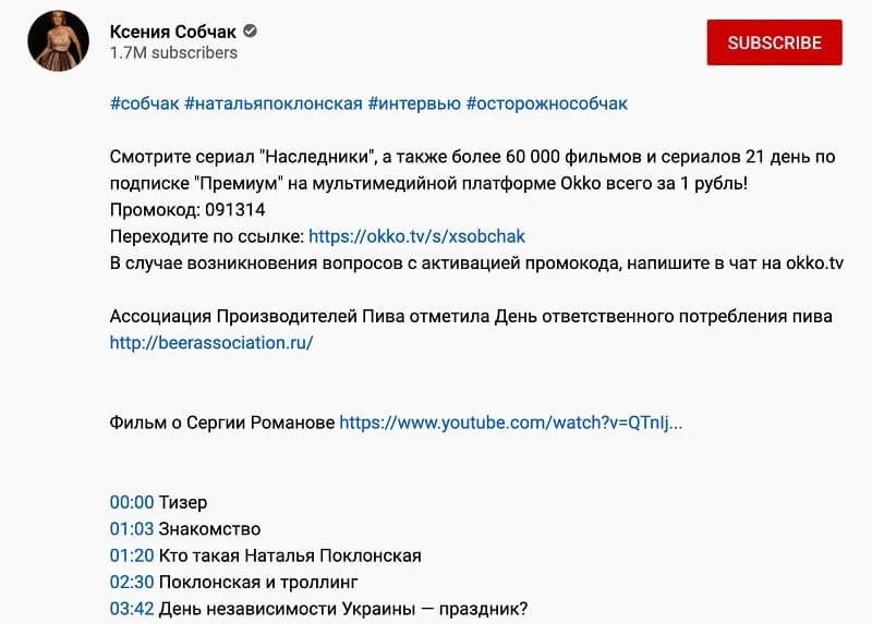 Тайм-код опубликуется автоматически, в описании ролика он превратится в кликабельную ссылку, которая переносит пользователя в нужное место в ролике.