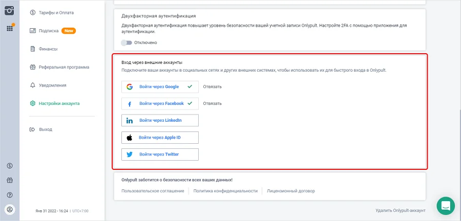Теперь вы можете легко настроить авторизацию через свои аккаунты в разных соцсетях так, чтобы попадать в один и тот же аккаунт Onlypult. Это сделает доступ к нему более удобным и быстрым. Просто привяжите разные способы авторизации в его настройках: