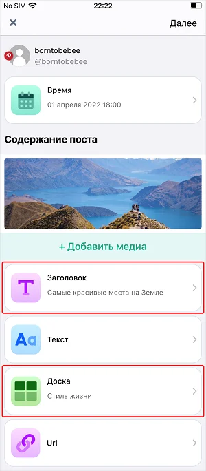 К механизму прямой публикации в Pinterest (без пуш-уведомлений), который был внедрен нами в конце прошлого года, мы добавили возможность выбирать в форме поста нужную доску и давать пину заголовок: