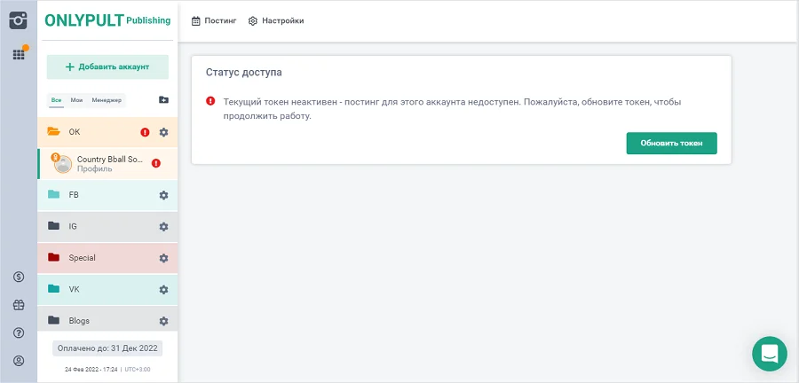 Если токен вашего объекта соцсети “Одноклассники” истек или утрачен, вы будете оповещены об этом при попытке запланировать пост. Для обновления токена и возобновления постинга понадобится нажать только одну кнопку: