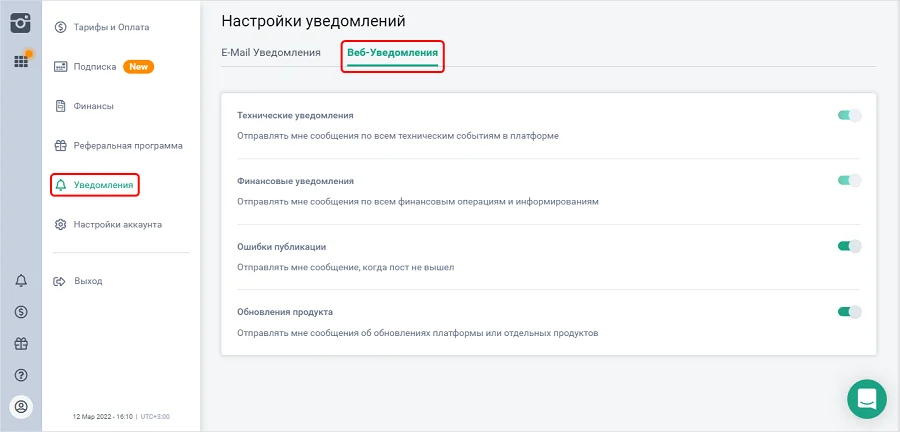 Включать/отключать получение уведомлений, а также выбирать их типы, вы можете в настройках своего аккаунта: