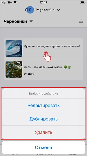 Меню появляется при нажатии на пост в любом из списков - “Запланировано”, “Прошедшие”, “Черновики”, “Ошибки”: