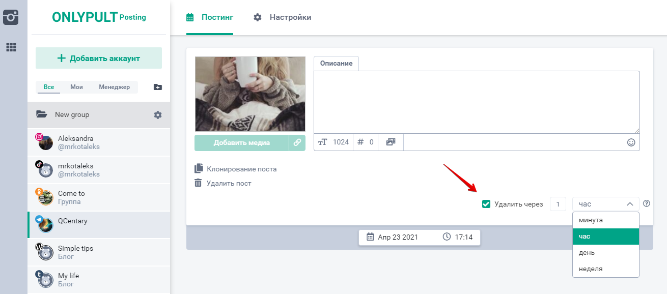 Вы можете настроить автоматическое удаление постов из социальной сети в определенное время.