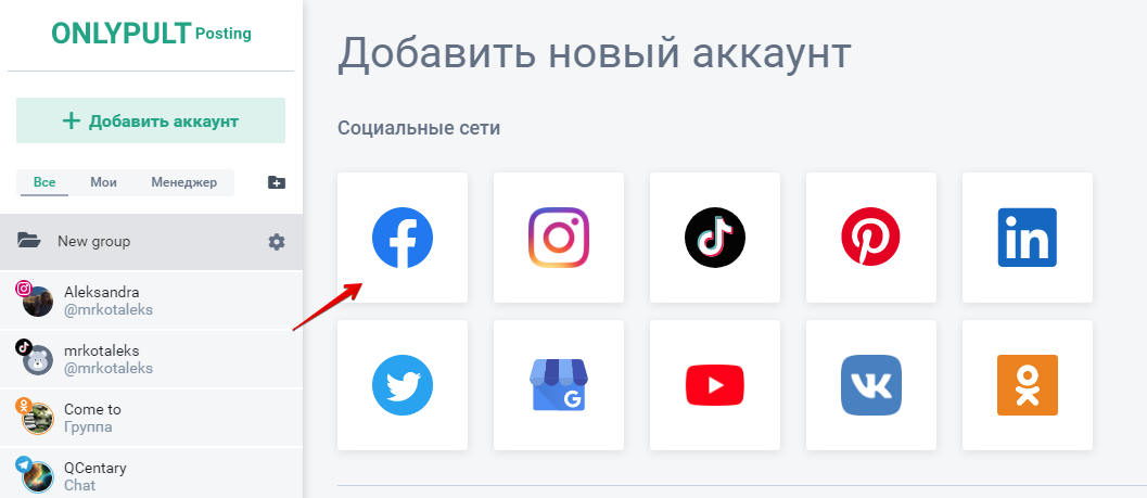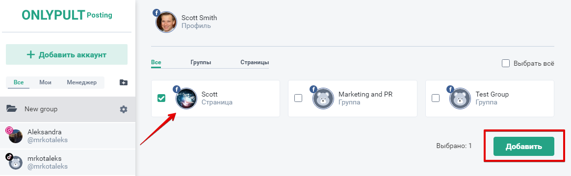 - Подключите нужные вам группы и страницы и нажмите кнопку “Добавить”.