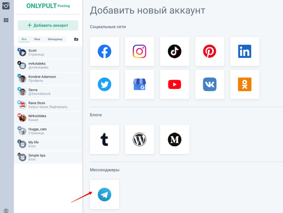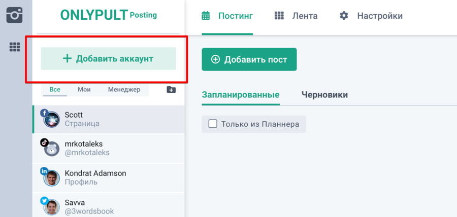 - На вкладке “Постинг” нажмите “Добавить аккаунт”.