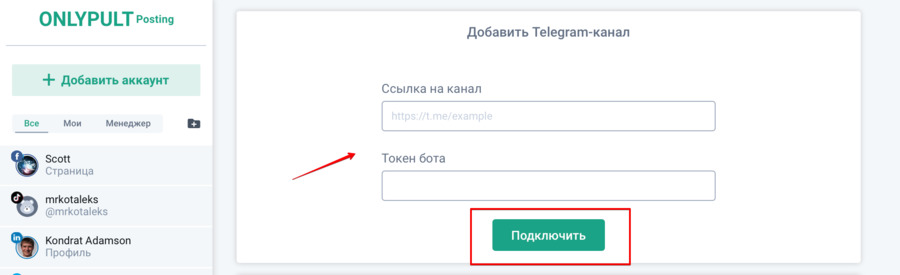 - Введите ссылку на канал и токен. Нажмите “Подключить”.