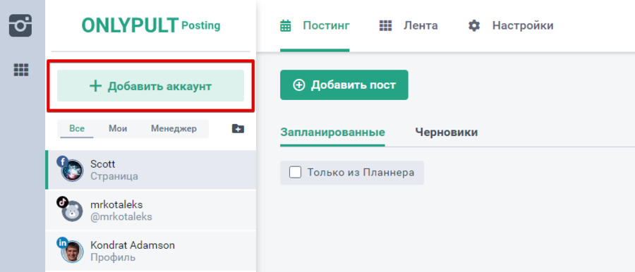 - На вкладке “Публикация” нажмите кнопку “Добавить аккаунт”.