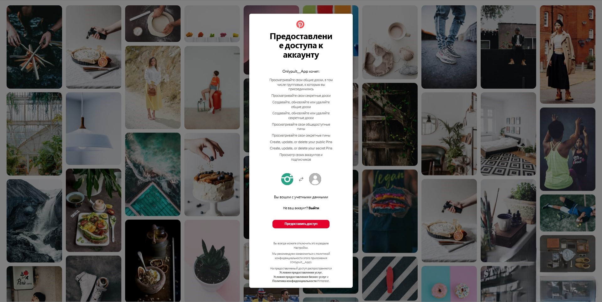 - Нажмите “Предоставить доступ” OnlyPult в аккаунт Pinterest.