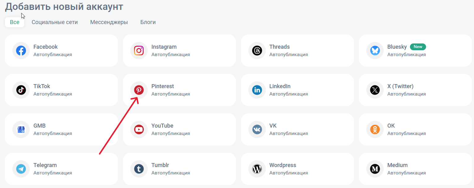 - На вкладке “Публикация” нажмите “Добавить аккаунт”.